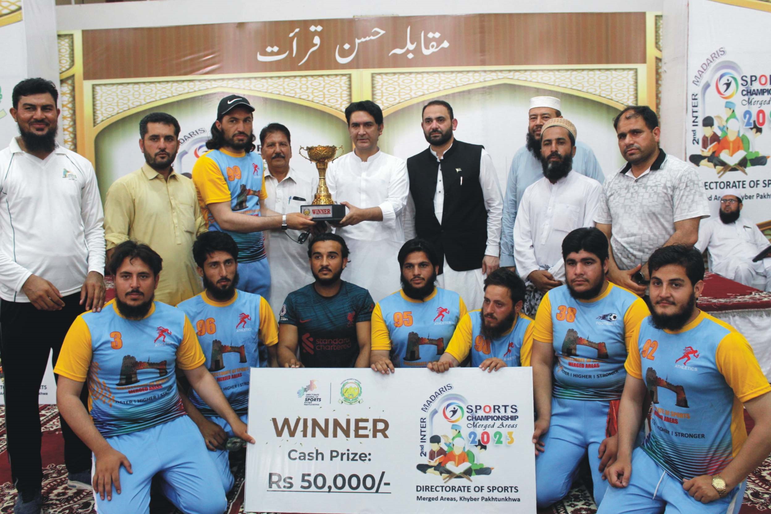 پشاور(عبدالصمد خٹک)پشاور میں جاری انٹر مدارس گیمز اختتام پذیر ہوگئی، ضلع مہمند کے کھلاڑیوں نے بہترین پرفارمنس کا مظاہرہ کرتے ہوئے والی بال اور قراء ت مقابلوں میں پہلی پوزیشن حاصل کرتے ہوئے میلہ لوٹ لیا، سیکرٹری سپورٹس کیپٹن (ر) مشتاق احمد نے کھلاڑیوں میں انعامات تقسیم کئے ان کے ہمراہ ڈائریکٹر سپورٹس ضم اضلاع پیر عبداللہ شاہ،ڈائریکٹراپریشن عزیز اللہ،اے ڈی ایڈمن عمران اللہ،اے ڈی سپورٹس راحید گل، ایوب خان ، ڈسٹرکٹ سپورٹس آفیسر ساجد آفریدی،اسسٹنٹ ڈائریکٹر ایڈمن ومیڈیا فوکل پرسن اعوان حسین سمیت دیگر اہم شخصیات موجود تھیں،ڈائریکٹریٹ آف سپورٹس ضم اضلاع کے زیر اہتمام طہماس خان فٹبال سٹیڈیم پر منعقد ہ فٹبال فائنل میں ضلع خیبر نے سنسنی خیز مقابلے کے بعد سب ڈویژن کوہاٹ کو 6-5 سے شکست دیکر ٹرافی اپنے نام کی، قراء ت مقابلوں میں ضلع مہمند کے قاری محمد احسان نے پہلی پوزیشن حاصل کی، ضلع خیبر کے قاری محب اللہ نے دوسری اور ضلع کرم کے جہانزیب علی نے تیسری پوزیشن حاصل کی اس موقع پر مولاناسلیمان فدا، قاری عبدالشکور اورقاری راحت باز نے ججز کے فرائض انجام دیئے